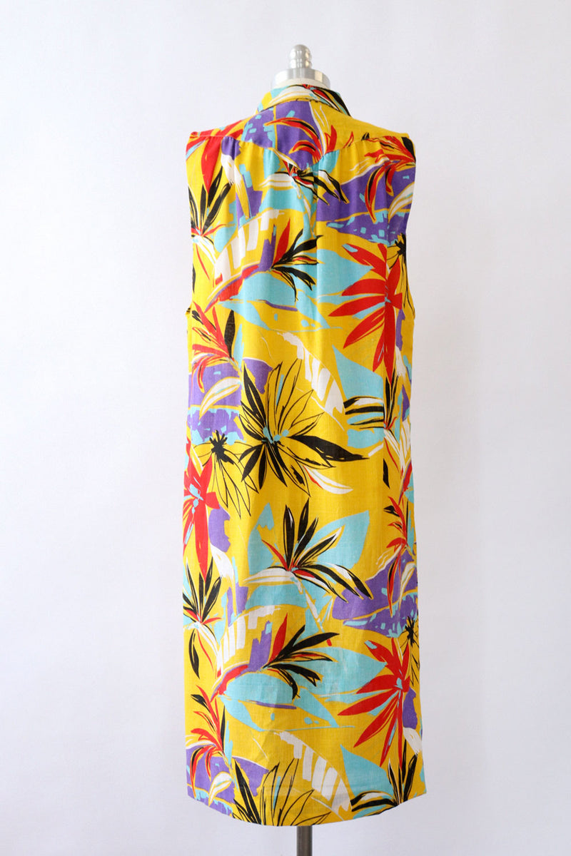 This sunny button down dress (or vest!) has a saturated color palette and dreamy tropical floral motif. A straight midi-length cut that skims the hips, with a crisp pointed collar, large patch pockets on the hips, and contrasting black buttons all the way down the front. The rich gold yellow linen-like weave is accented with tropical botanicals in shades of ultraviolet, scarlet, black, and white, making it pair perfectly with neutrals and brights alike. Try it withe simple sandals in summer or layered with a black turtleneck and knee high boots when temps cool down, it's also the perfect candidate for a wide red or black belt. By label Lanford II, made in U.S.A. circa 1980s.