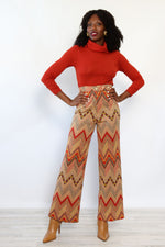 The. Best. Zigzag intarsia knit flares with a great mixed pattern design and a very cozy tan, hunter, crimson and marigold color palette. Super high waisted cut with minimal curve hugging stretch, decorative button tab and subtle center crease. No labels, well made, circa 1970s.